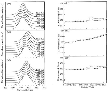 圖2三種樣品900mA常溫老化168h前后的EL譜圖[(a1)~(a3)]及老化前后三種樣品波長隨電流的變化關系[(b1)~(b3)]