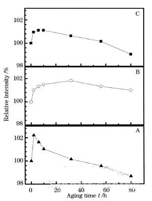 圖3是350mA電流下各樣品相對光強隨老化時間的變化關系,三種樣品都以老化前的光強為100%。從圖3中可以看 到,A,B,C三種樣品光強都隨老化時間的增加而先增大后減小,其中以A樣品在老化2h后光強增加最多,隨后隨著老化的進行光強就開始減小了,而B,C樣 品分別在老化了32h,10h光強才開始下降,并且下降的趨勢比A樣品慢。而且可看出在常溫900mA老化后A,B,C三種樣品350mA下光強都經(jīng)過一 個最大值然后減小,C樣品減小最多,A次之,B樣品的光強值雖在減小,但仍然比老化前的值大。此現(xiàn)象的原因為:MOCVD方法生長的GaN有部分受主Mg 由于與H形成Mg-H復合體而鈍化,Mg的激活率很低,導致空穴濃度較低,在大電流老化中,有部分Mg-H鍵被打斷而使受主Mg被激活,從而空穴濃度增 加,可能載流子濃度變得更加匹配,發(fā)光效率變高。另一方面,老化使GaN材料中位錯、缺陷等非輻射復合中心密度升高,從而發(fā)光效率降低,光強下降。這兩種 機制相互競爭,在老化初期,Mg受主激活機制占主導,因此同等電流下三種樣品光強都增加,隨著老化的進行,位錯、缺陷等非輻射復合中心增生機制逐漸占主 導,因此大電流老化一段時間后三種樣品光強都減小。三種樣品光衰的快慢不同可能是因為三種樣品量子阱的應力狀態(tài)及支撐基板熱導率不一樣造成非輻射復合中心 增生的程度不一樣引起的。