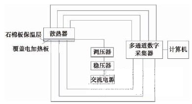 為了確保數(shù)值計算所選的數(shù)學模型、網(wǎng)格劃分、計算方法和邊界條件的可靠性,我們做了實驗研究。實驗測量過程在一個不受干擾的封閉空間進行,實驗系統(tǒng)圖如圖5所示。在試驗中,散熱器基板底面覆以電加熱板,用以模擬LED燈組產(chǎn)生的熱量。并在基板與電加熱板間填涂導熱硅脂,隔絕空氣熱阻。電加熱板下方用石棉板絕熱使電加熱板產(chǎn)生的熱量全部由散熱器散出。