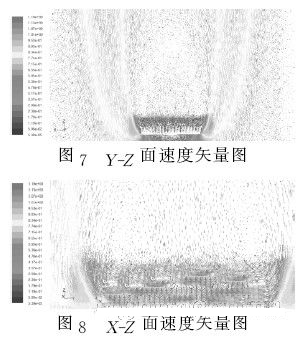 散熱器自然對流過程中,基板底面不斷地提供熱量,由于散熱器材料良好的導熱性,熱量使散熱器溫度不斷提高??拷崞髦車目諝馐軣?,密度變小,與遠離散熱器的空氣形成密度差,產(chǎn)生了浮力。在散熱過程中,數(shù)值計算結(jié)果可以得到在Y-Z面中的速度矢量場如圖7所示??梢灾庇^地看出空氣因為散熱器的基板底面 在浮力的作用下,擾流冷卻散熱器的時候,空氣直接從散熱器四周往上走,卻不能進入散熱器肋片間對散熱器進行冷卻。在電加熱板的加熱量與散熱器的散熱量平衡 時,散熱器肋片都成了等溫壁面。速度又是由溫度差引起的,速度小導致空氣的浮生力小于粘性力。散熱器周圍的冷空氣從散熱器四周往上運動,到最終混為一起的 時候,在散熱器肋片的上方形成了一個很大的滯流區(qū)域。從圖8 X-Z面的速度矢量圖可以看出在肋片方向上的滯流區(qū)域里的兩端形成了兩個小渦,阻止了周圍空 氣進入散熱器肋片里。又因為在粘性力的作用下,這個滯流區(qū)域里空氣流速非常小,所以在這樣的結(jié)構(gòu)下,散熱器的肋片就沒有充分發(fā)揮出自然對流的散熱效果。