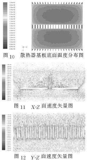 為了分析新結(jié)構(gòu)散熱器的散熱能力,對比實驗驗證了數(shù)值計算可靠性,所以我們采用同樣的數(shù)學模型、網(wǎng)格劃分、計算方法和邊界條件來數(shù)值計算分析,這樣省 時,高效,成本低。計算結(jié)果顯示散熱器新結(jié)構(gòu)的基板底面溫度分布圖如圖10所示。在相同功率下,雖然基板底面受熱面積有所減小,底面單位熱流密度有所增 加。但是散熱器的基板底面最高溫度依然比原模型降低了5℃。肋片平均換熱系數(shù)也由5.1W/(m2·K)提高為6.0W/(m2·K)。從X-Z面,Y- Z面上的速度矢量圖11、12可以看出新結(jié)構(gòu)在散熱器中間實現(xiàn)了空氣上下流通,增加了空氣的流通量,受熱空氣擾流散熱器中部肋片時的最大速度也只有 0.9m/s左右,這種新結(jié)構(gòu)下,當工作環(huán)境在有風的條件下,更會強化換熱效果,使散熱效果更佳。這種新結(jié)構(gòu)加工程序簡單,減輕了散熱器的重量和總的金屬 消耗量,也方便于自動化生產(chǎn)及安裝。