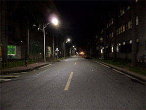 80W LED路燈代替原有250W高壓鈉燈,共計(jì)6盞,桿高6米,桿距20米,路面平均照度比原來用高壓鈉燈照度高11 lx。