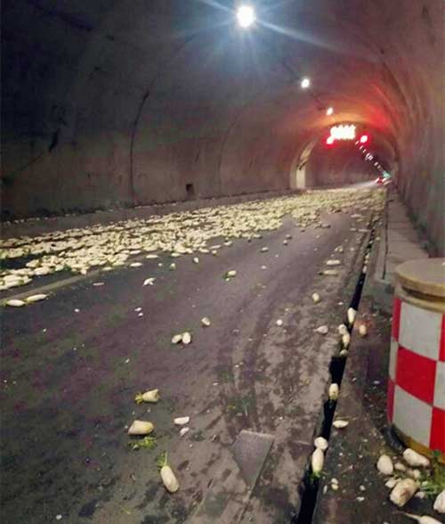 近日,重慶一輛紅色貨車與私家車在隧道相撞,貨車發(fā)生側(cè)翻,車廂內(nèi)的蘿卜全部倒出,滾落一地,現(xiàn)場(chǎng)一片狼藉。私家車由于劇烈撞擊,車頭嚴(yán)重受損,引擎蓋高高翹起。貨車側(cè)翻,歪歪斜斜的躺在馬路中間,一時(shí)造成了交通堵塞。